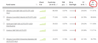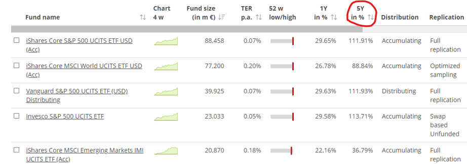 Na seguinte imagem podes ver alguns dos ETF's disponíveis. Algo que pode ser relevante para ti será ir à coluna "5Y in %" e ordenar de forma decrescente. Assim poderás ver os ETF's com maior crescimento nos últimos 5 anos, que é sem dúvida um critério importante para a escolha de um ETF (apesar de rentabilidades passadas não garantirem rentabilidades no futuro!).