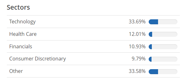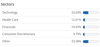 Outro fator importante é a diversidade de indústrias que o ETF abrange. Neste caso, podemos ver que este em questão tem uma grande variedade de sectores, havendo um domínio da indústria tecnológica (o que é compreensível nos dias de hoje). O nosso conselho é que escolhas um ETF como este, caso pretendas um ETF diversificado, não estando exposto apenas a 1 área. A diversificação é uma das melhores formas de diminuir o risco!